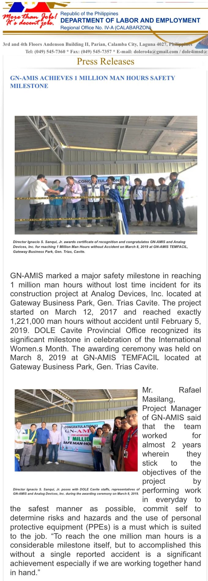 Major Safety Milestone - One (1) Million man hours without lost time incident due to combined effort of GN-AMIS team and Analog Project/Safety Team.